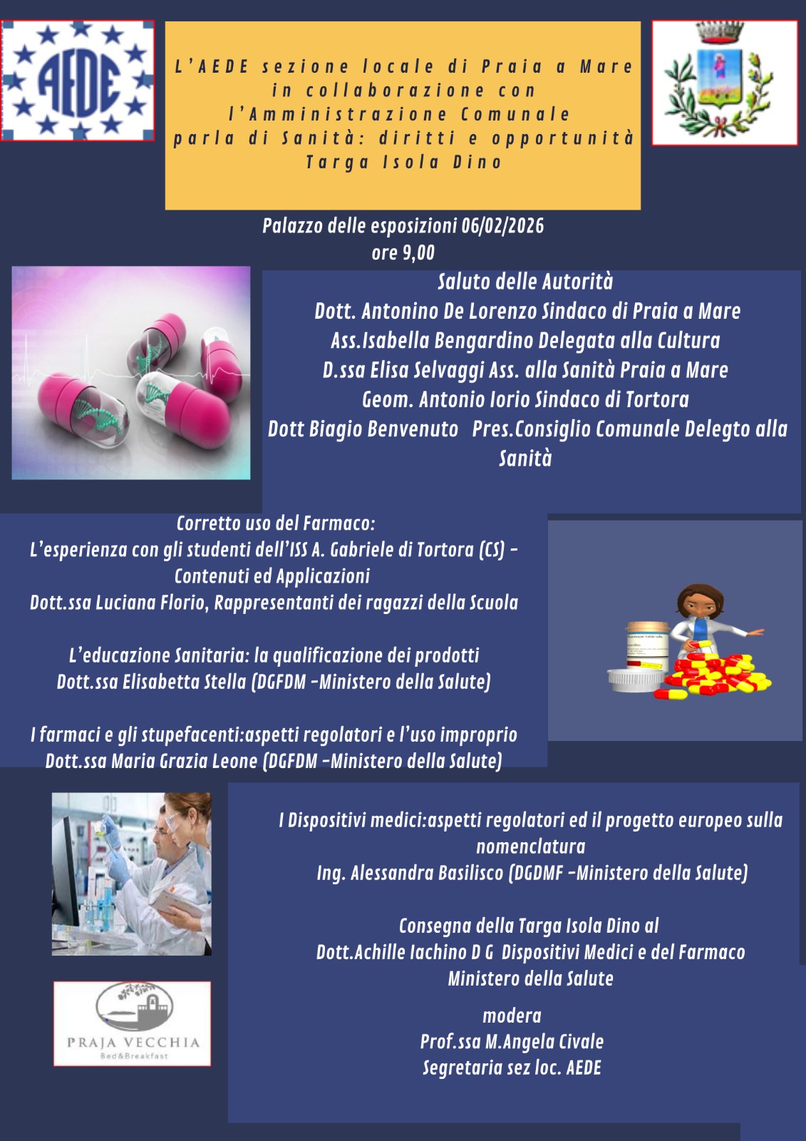Il convegno moderato dalla Prof.ssa Mariangela Civale responsabile dell’AEDE sezione di Praia a Mare ha visto come relatori la Dott.ssa Elisabetta Stella, la Dott.ssa Maria Grazia Leone e l’Ing. Alessandra Basilisco del DGDMF Ministero della Salute.