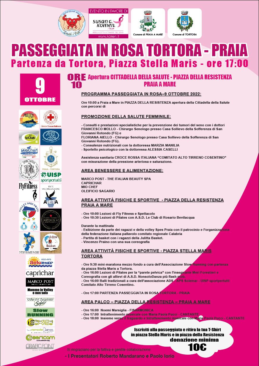 Sempre a partire dalle ore 10 di domenica 9 ottobre, anche piazza Stella Maris di Tortora sarà adibita alle attività fisiche e sportive. Proprio da qui, alle ore 17, partirà la Passeggiata in Rosa che terminerà a piazza della Resistenza di Praia a Mare.