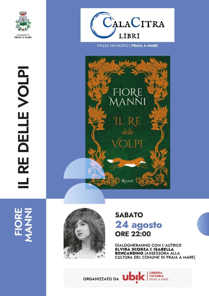 Si terrà questa sera, sabato 24 agosto, alle ore 22, in piazza Municipio, la presentazione del libro “Il re delle volpi” di Fiore Manni. L’appuntamento rientra nel cartellone degli eventi afferente al CalaCitra Libri, kermesse giunta alla sua seconda edizione organizzata dall’associazione “Ginepraio” e dalla Ubik di Praia a Mare.