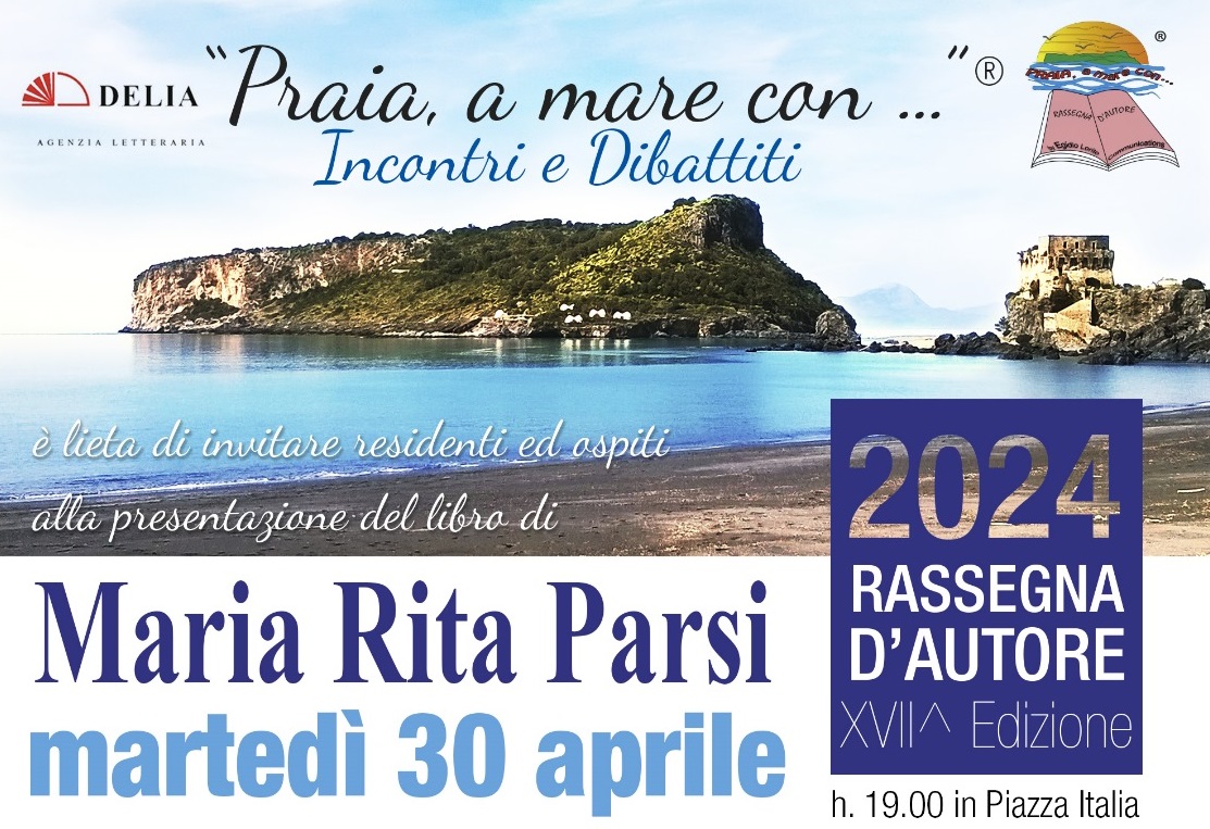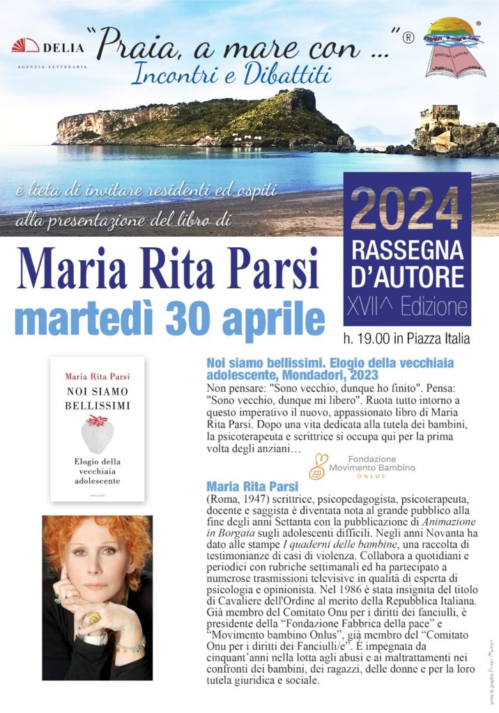 Appuntamento primaverile con la rassegna “Praia, a mare con…”, ideata e curata da Egidio Lorito. Martedì 30 aprile, alle ore 19, in piazza Italia, ospite del salotto culturale del giornalista praiese sarà Maria Rita Parsi, scrittrice, pedagogista e psicoterapeuta, che ha sempre dedicato la sua attenzione agli adolescenti difficili.