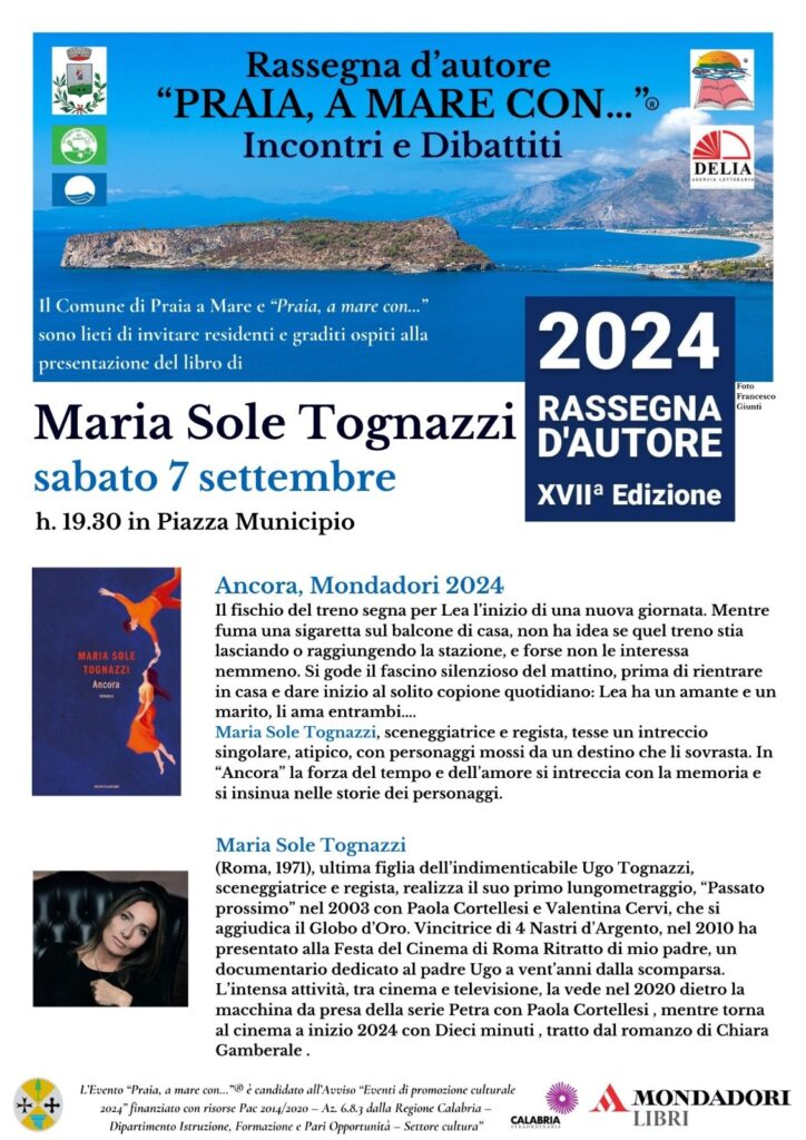 Anche settembre si presenta ricco di appuntamenti; continua infatti la kermesse letteraria ideata e moderata dal giornalista di Panorama, Egidio Lorito. Sabato 07 settembre, alle ore 19.30, il salotto di “Praia, a mare con…”, allestito in piazza Municipio, ospiterà Maria Sole Tognazzi. La sceneggiatrice e regista, nonché ultima figlia di Ugo Tognazzi, presenterà il suo romanzo “Ancora”.