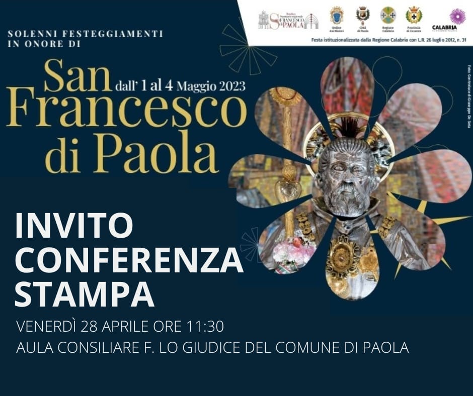 Si terrà Venerdì 28 Aprile, alle ore 11:30 presso la sala consiliare F. Lo Giudice del comune di Paola, la conferenza stampa di presentazione del programma, civile e religioso, dei solenni festeggiamenti in Onore di San Francesco di Paola.