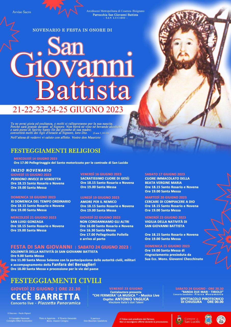 Tradizione e innovazione, i riti della fede, grande musica, sorprese per grandi e bambini, tutto in un turbinio di colori e sapori: San Lucido si appresta a onorare il suo Santo Patrono, San Giovanni Battista, nei giorni a lui dedicati, 21-22-23-24-25 Giugno, con un programma religioso e civile ricco di appuntamenti iconici e di grandi sorprese.