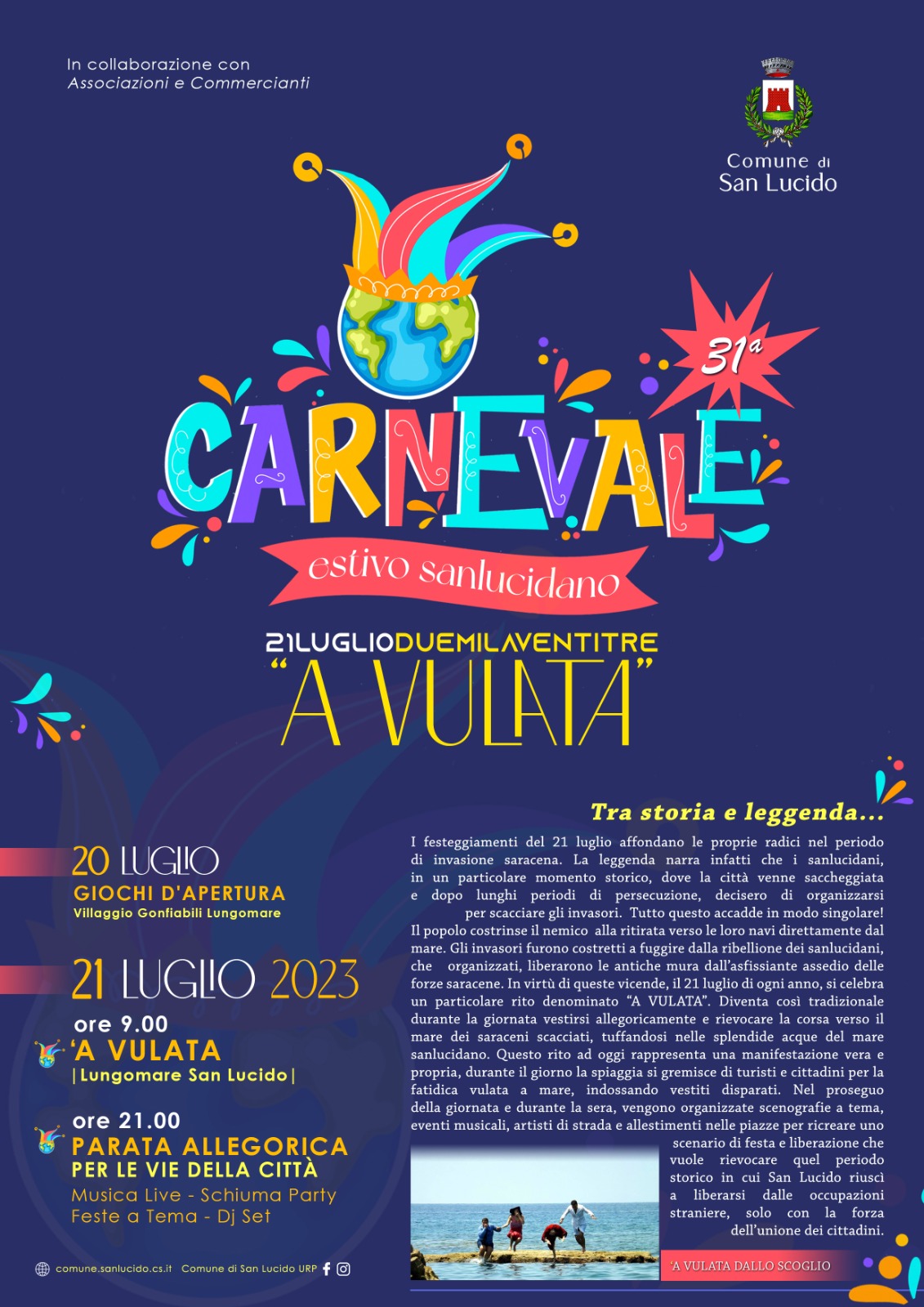 La prima giornata del Carnevale Estivo sarà inaugurata con i giochi d’apertura nel villaggio gonfiabili sul lungomare, offrendo ai partecipanti l’opportunità di immergersi in un’atmosfera divertente e giocosa. Il 21 luglio, a partire dalle ore 9:00, avrà luogo lo storico appuntamento de “A’ Vulata” sul Lungomare di San Lucido. Questa tradizione affonda le sue radici nel periodo dell’invasione saracena, quando i sanlucidani, dopo essere stati saccheggiati e perseguitati per lungo tempo, si organizzarono per scacciare gli invasori. Il popolo riuscì a costringere il nemico alla ritirata verso le navi direttamente dal mare. In ricordo di queste vicende, il 21 luglio di ogni anno si celebra questo rito unico con il tuffo simbolico nelle acque splendide del mare sanlucidano.