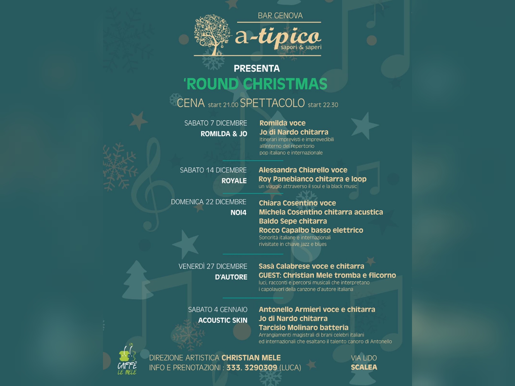 Un connubio perfetto tra la passione per la musica e il gusto per la buona cucina. Il Caffè Le Mele e il Bar A-tipico uniscono le forze per regalare alla città di Scalea un Natale indimenticabile. Sotto la sapiente direzione artistica di Christian Mele, nasce “Round Christmas”, una rassegna musicale che animerà le festività con un ricco calendario di eventi.