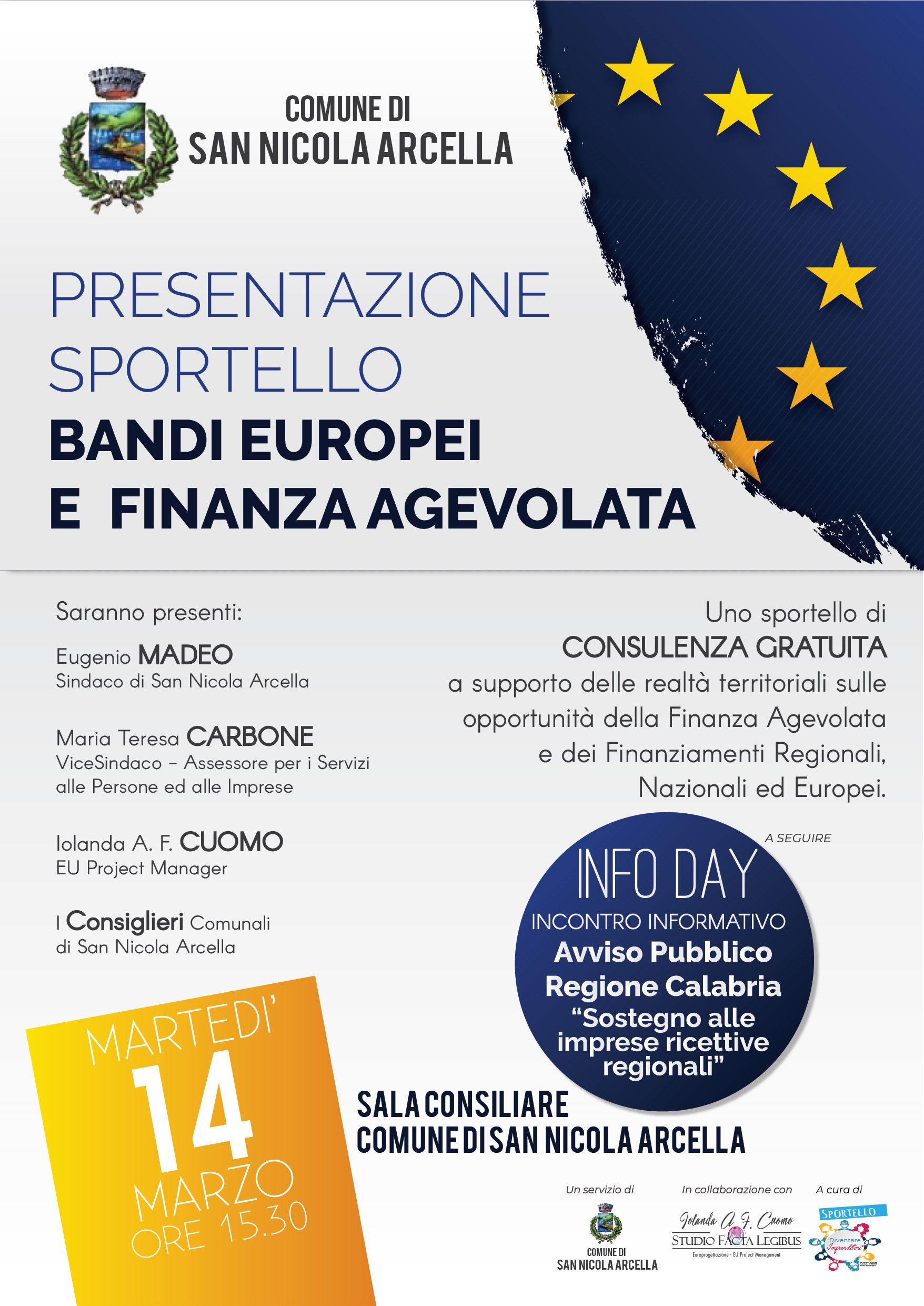 Il comune di San Nicola Arcella inaugura il 14 marzo lo sportello di informazione per la finanza agevolata. L’Amministrazione Comunale, in collaborazione con la dott.ssa Iolanda A. F. Cuomo, inaugura un nuovo servizio per essere di supporto agli imprenditori, ai cittadini ed al mondo dell’associazionismo e del no profit presenti sul territorio.