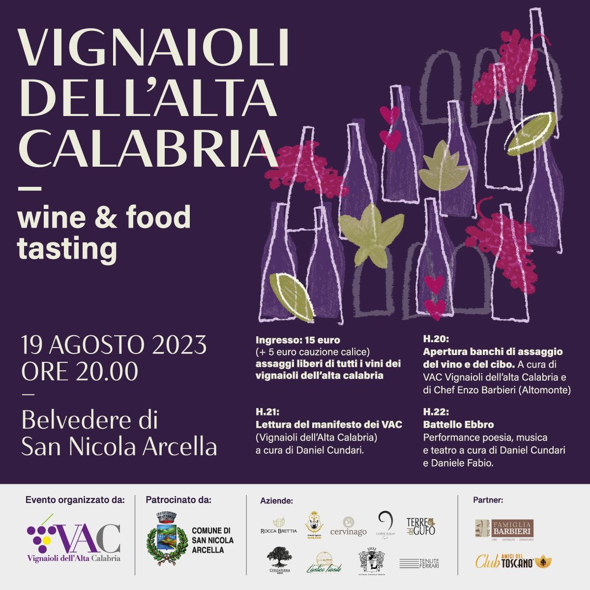 L’evento organizzato dalla rete dei VAC – Vignaioli dell’Alta Calabria consiste in una serata di assaggi di vini artigianali e di cibo preparato dallo Chef Enzo Barbieri in una cornice paesaggistica unica come quella del Belvedere di San Nicola, arricchita dalle performance artistiche di Daniel Cundari e Daniele Fabio.