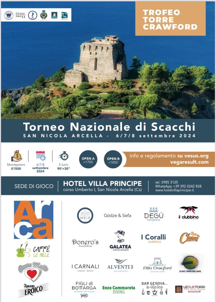 La splendida cornice dell’Hotel Villa Principe di San Nicola Arcella ospiterà il terzo Trofeo Torre Crawford, organizzato dall’ASD scacchi Riviera dei Cedri, un evento di grande rilevanza nel panorama del turismo sportivo italiano. Il torneo, che si terrà 6-7-8 settembre 2024, vedrà la partecipazione di oltre 80 giocatori provenienti da tutte le regioni d’Italia, pronti a sfidarsi in un contesto suggestivo e accogliente.
