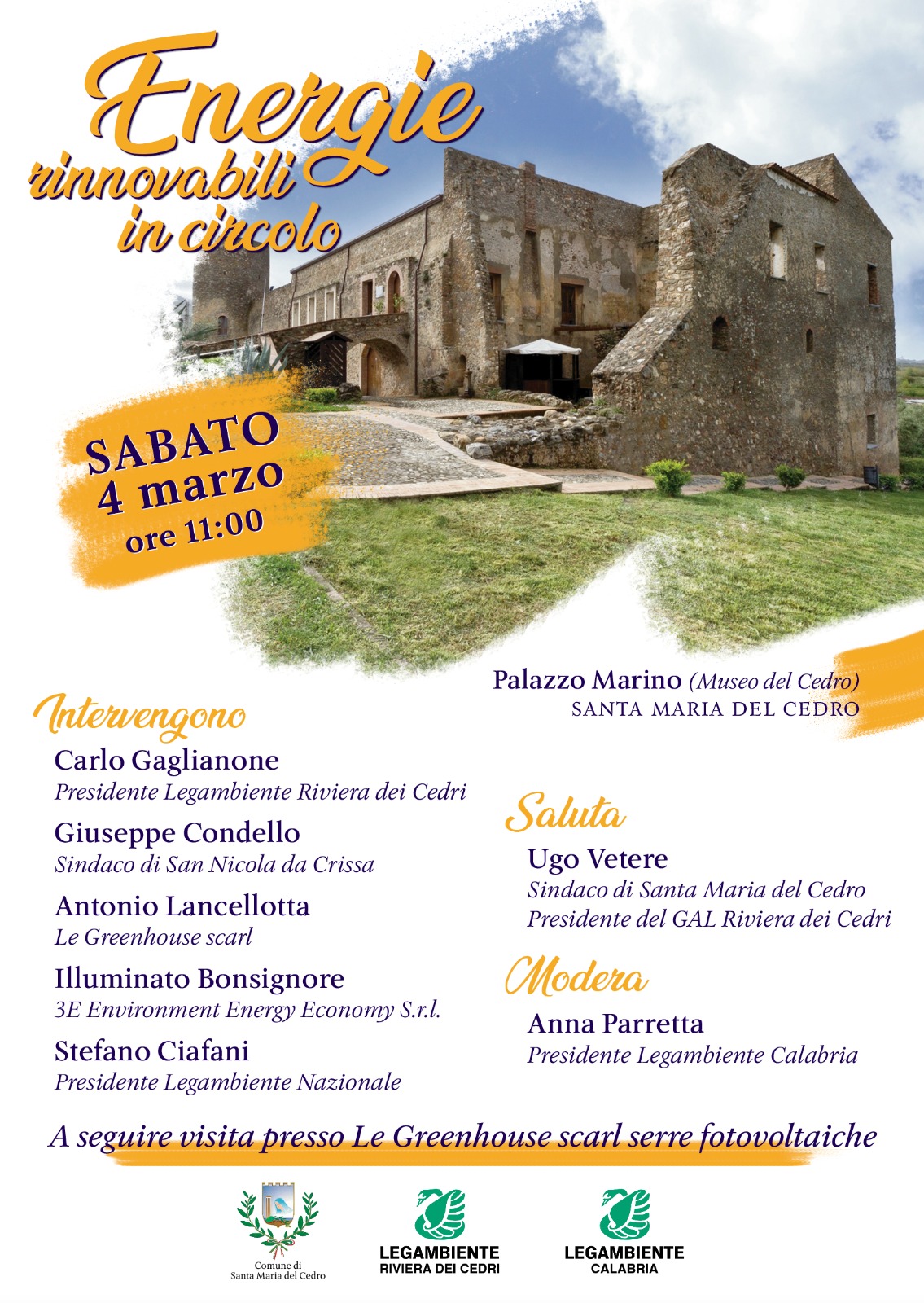 Dopo i saluti del sindaco di Santa Maria del Cedro, Ugo Vetere, interverranno Carlo Gaglianone, presidente di Legambiente Riviera dei Cedri; Giuseppe Condello, sindaco di San Nicola da Crissa; Antonio Lancellotta di Le Greenhouse Scarl; Illuminato Bonsignore di 3E Srl e Stefano Ciafani, presidente di Legambiente nazionale.