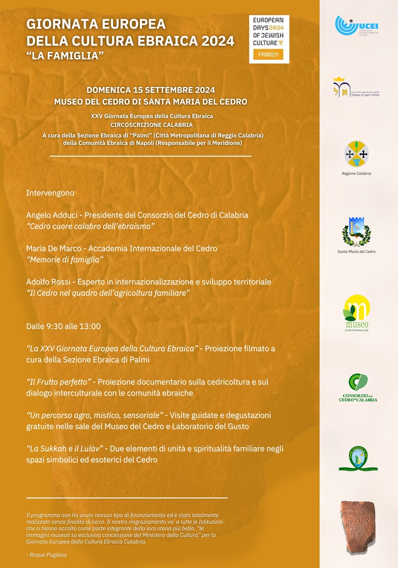 Tra le attività previste, la proiezione del filmato di presentazione della “XXV Giornata Europea della Cultura Ebraica”, a cura della Sezione Ebraica di Palmi, e il documentario “Il Frutto Perfetto”, che racconta il dialogo interculturale con le comunità ebraiche attraverso il “Cedro di Santa Maria del Cedro”, simbolo di dialogo e di confronto interculturale ed interreligioso.