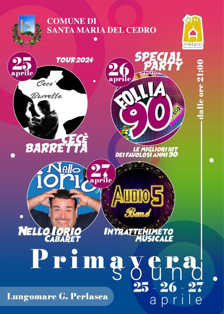 “Primavera Sound – commenta l’amministrazione comunale di Santa Maria del Cedro – è una iniziativa dedicata ai cittadini e ai turisti della nostra cittadina e dei comuni limitrofi, nata con un duplice obiettivo. Da un lato, risponde all’esigenza di fornire intrattenimento in un periodo caratterizzato da giorni feriali ‘extra’ dovuti al ponte per la Liberazione. Dall’altro – viene aggiunto – si inserisce nel solco della necessità di riempire di contenuti l’infrastruttura ‘contenitore’ del lungomare cittadino, che vogliamo si affermi sempre più, al pari di altre opere realizzate negli scorsi anni, come attrattore di presenze turistiche”.