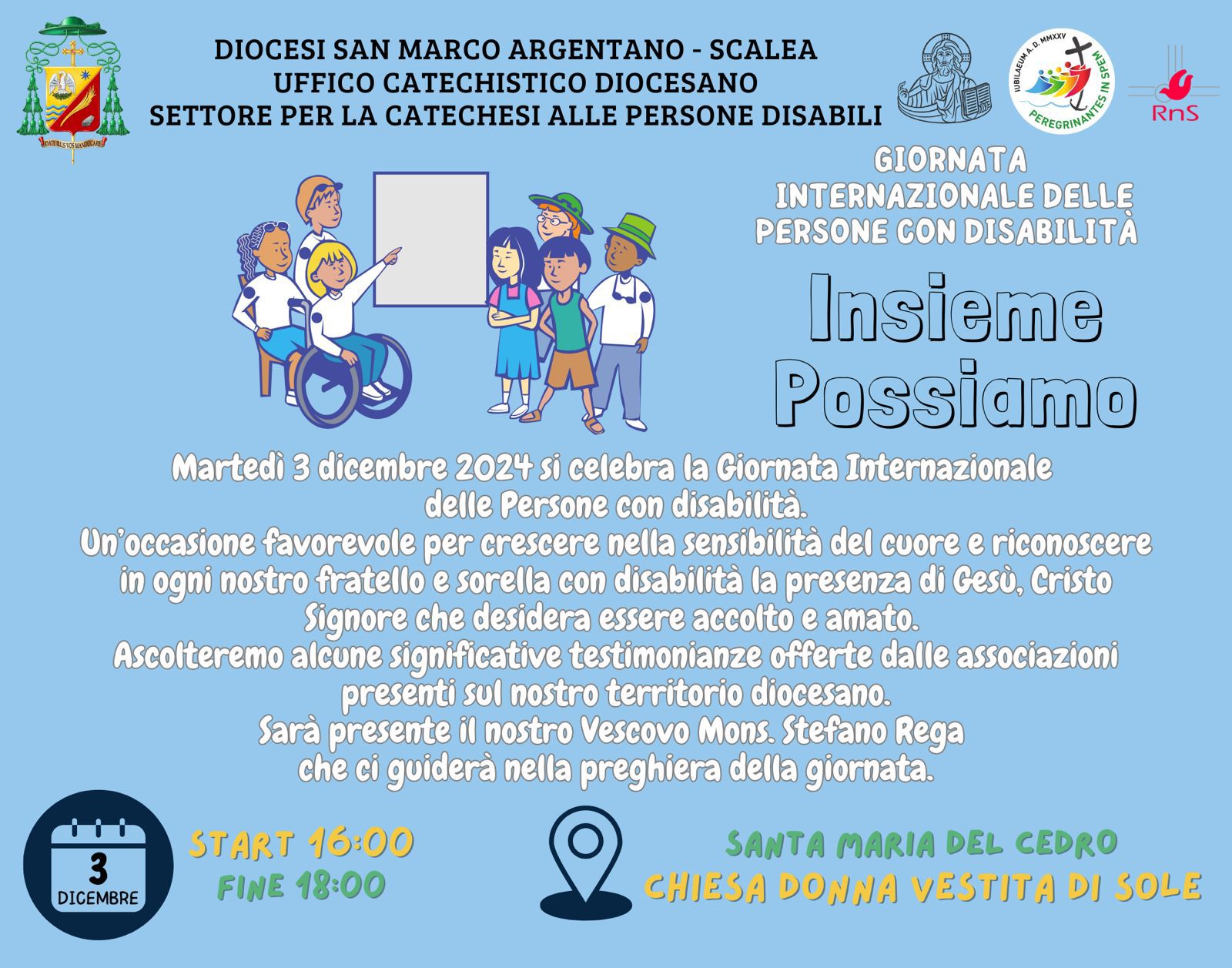 “Insieme possiamo”, questo il titolo dell’iniziativa che si terrà domani, martedì 03 dicembre, a partire dalle ore 16, presso la chiesa “Donna vestita di sole” di Santa Maria del Cedro, in occasione della “Giornata internazionale delle persone con disabilità”.