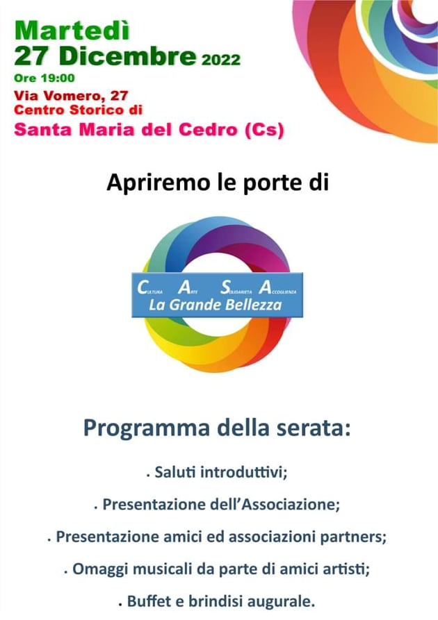 SANTA MARIA DEL CEDRO. MARTEDì 27 DICEMBRE L’INAUGURAZIONE DELL’ASSOCIAZIONE “CASA. LA GRANDE BELLEZZA”