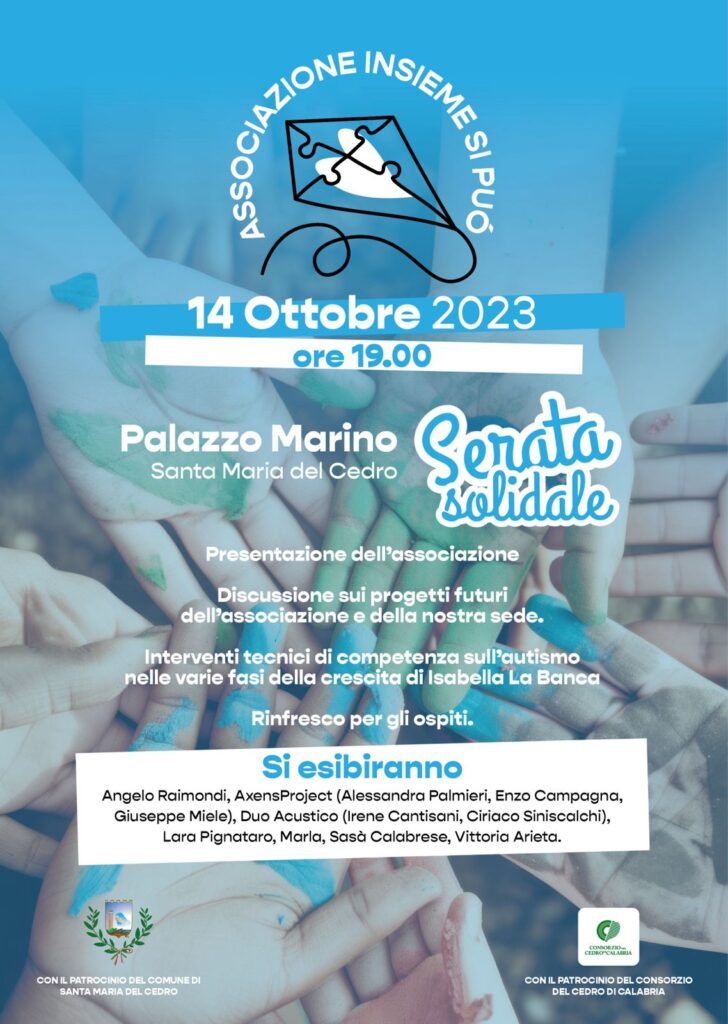 Si terrà sabato 14 ottobre, alle ore 19, presso Palazzo Marino di Santa Maria del Cedro, la serata solidale dell’associazione “Insieme si può”. Il sodalizio, composto da madri e specialisti nell’area dello spettro autistico, invita tutti a prendere parte a questo momento di discussione, durante cui verranno proposti anche i progetti futuri.