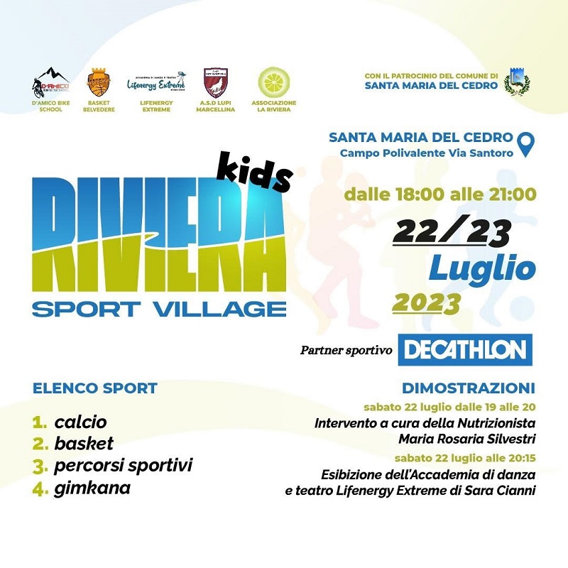 Calcio, basket, percorsi sportivi, gimkana. Due giorni di festa sabato e domenica dalle ore 18.00 alle 21.00 presso il campo Polivalente a Santa Maria del Cedro, organizzati dall’Associazione Culturale La Riviera, in collaborazione con D’Amico Bike School, Basket Belvedere, Lifenergy Extreme, A.S.D. Lupi Marcellina, in partnership con Decathlon ed il patrocinio del Comune di Santa Maria del Cedro.