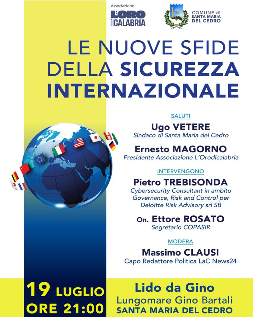 “Le nuove sfide della sicurezza internazionale”, è il titolo dell’importante incontro che si terrà Il prossimo 19 luglio alle ore 21.00, a Santa Maria del Cedro, presso il “Lido da Gino” sul Lungomare Gino Bartali.