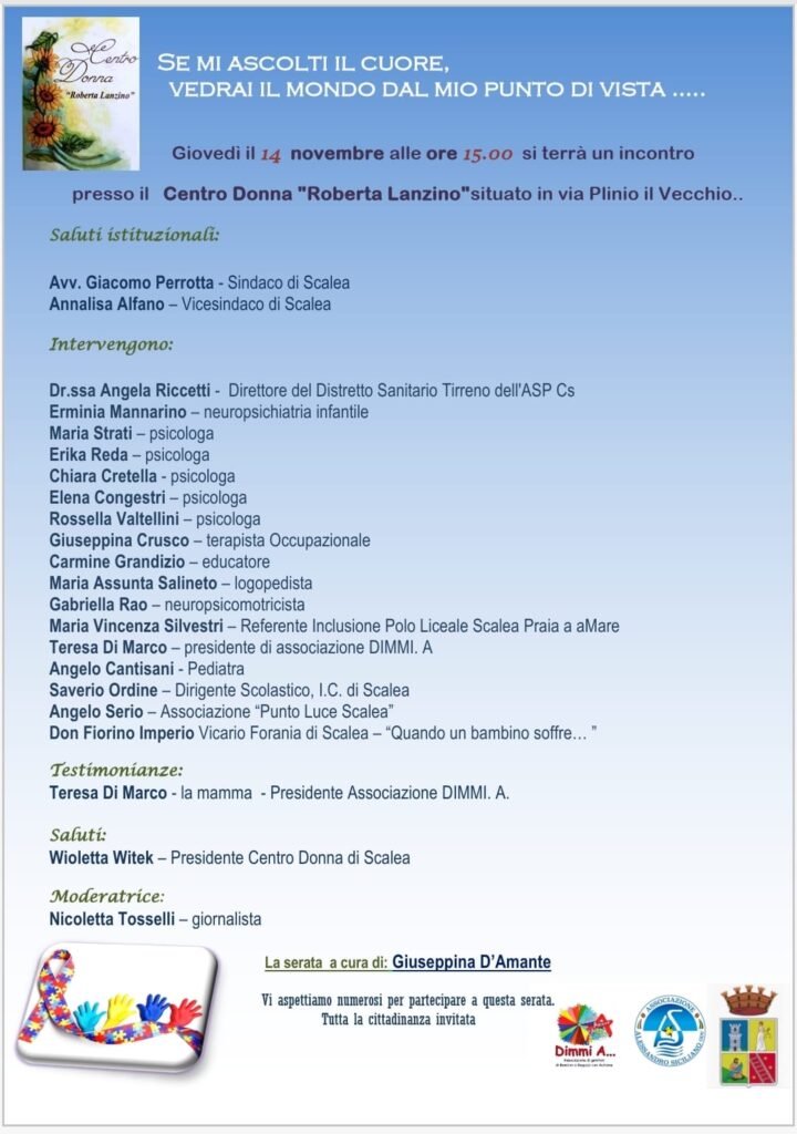 “Se mi ascolti il cuore, vedrai il mondo dal mio punto di vista”. Questo il messaggio che farà da cornice al convegno sull’autismo che si terrà giovedì 14 novembre, a partire dalle ore 15, presso il Centro Donna “Roberta Lanzino” di Scalea, situato in via Plinio Il Vecchio.