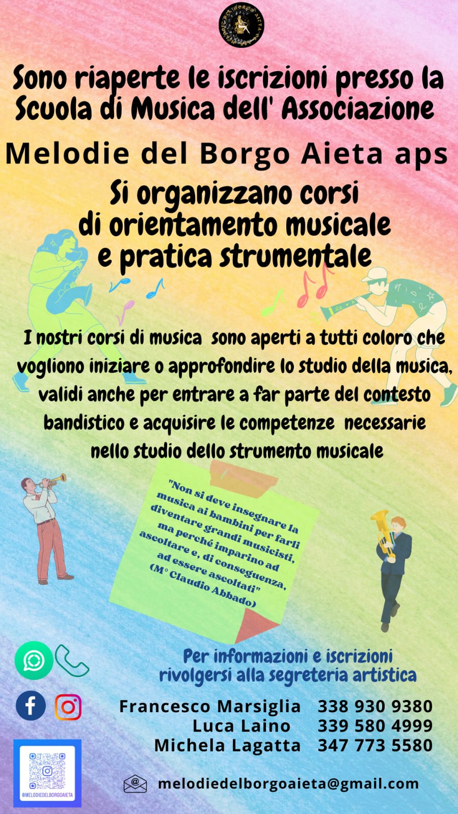 Per info si può contattare l’associazione all’indirizzo email melodiedelborgoaieta@gmail.com oppure si possono usare i numeri telefonici riportati in locandina.