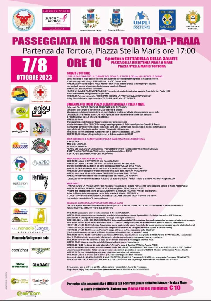 Il tutto si concluderà con la Passeggiata in rosa che partirà domenica 08 ottobre da piazza Stella Maris, alle ore 17, per terminare a piazza della Resistenza. Nel mezzo però sport, musica e momenti di intrattenimento che allieteranno la due giorni. L’iniziativa ha ricevuto i patrocini dei comuni di Praia a Mare e Tortora, dell’Unpli Cosenza, della Provincia di Cosenza e della Regione Calabria.