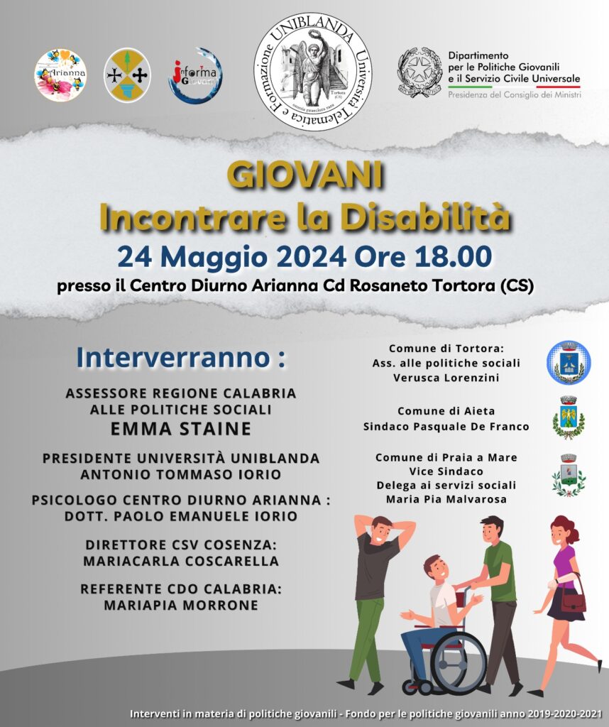 “Giovani, incontrare la disabilità” è il titolo del convegno che si terrà al Centro Arianna di Tortora, in contrada Rosaneto, venerdì 24 maggio, alle ore 18. A organizzarlo i componenti delle associazioni Uniblanda, Arianna e InformaGiovani. Il tutto è patrocinato dalla Regione Calabria e dal Dipartimento per le politiche giovanili e il servizio civile universale della Presidenza del Consiglio dei Ministri.