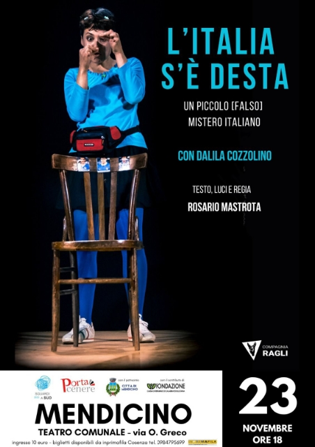A inaugurare la stagione teatrale, il 23 novembre (alle ore 18), sarà la Compagnia Ragli con “L’Italia s’è desta. Un piccolo [falso] mistero italiano”, interpretato da Dalila Cozzolino, con testo, luci e regia firmati da Rosario Mastrota. Protagonista è Carletta, la “scema del paese”, una figura fragile e visionaria che assiste a un evento tanto improbabile quanto dirompente: il rapimento, ad opera della ’ndrangheta, del pullman della Nazionale italiana di calcio a due mesi dai Mondiali. Una notizia-bomba che esplode sui media. Esercito, politica, giornalisti: tutti accorrono, travolti dall’ossessione della notizia generando un assalto cieco e famelico alla verità. Ma la verità – quella fragile e scomoda – sta sulle labbra di Carla, l’unica testimone.